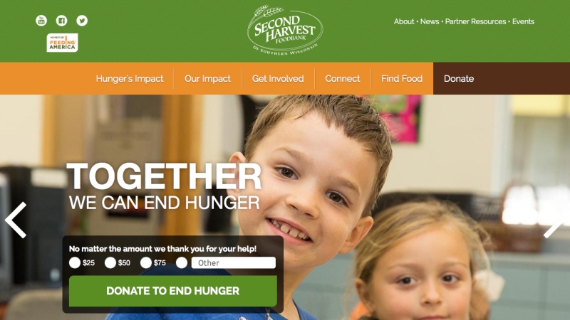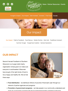 1 in 8 southwestern Wisconsinites struggle with real hunger every day: that means more than watering down a meal to stretch another day, it means crumpling up paper to put inside a child’s brown bag to avoid embarrassment at school. The Second Harvest Food Bank of Southern Wisconsin’s mission is to end hunger through community partnerships and has succeeded in putting more than 100 million meals on the tables of Madison-area families by coordinating the work of volunteers and donors together with hundreds of local hunger-relief charities. To assist in that mission, Second Harvest Madison hired NMC to redesign and build a modern, mobile-responsive website that integrated Blackbaud software for donations and Google Calendar for events.