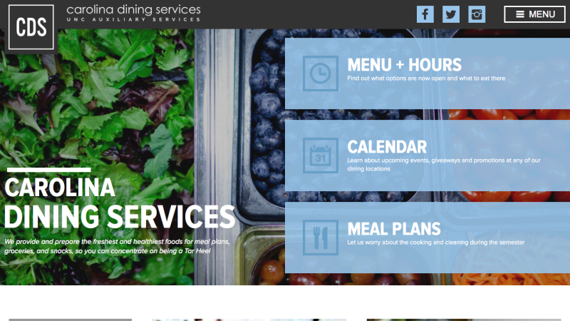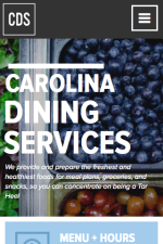 Working backwards from there, you’ll see that all three actions are the most important visual elements on the home page and what most visitors are interested in. But beyond that is a wealth of site information: details about meal plans, catering, and even UNC Dining's commitment to sustainability, all easily accessible from an interactive menu. Click or tap for instant access to all the site's content at a glance.