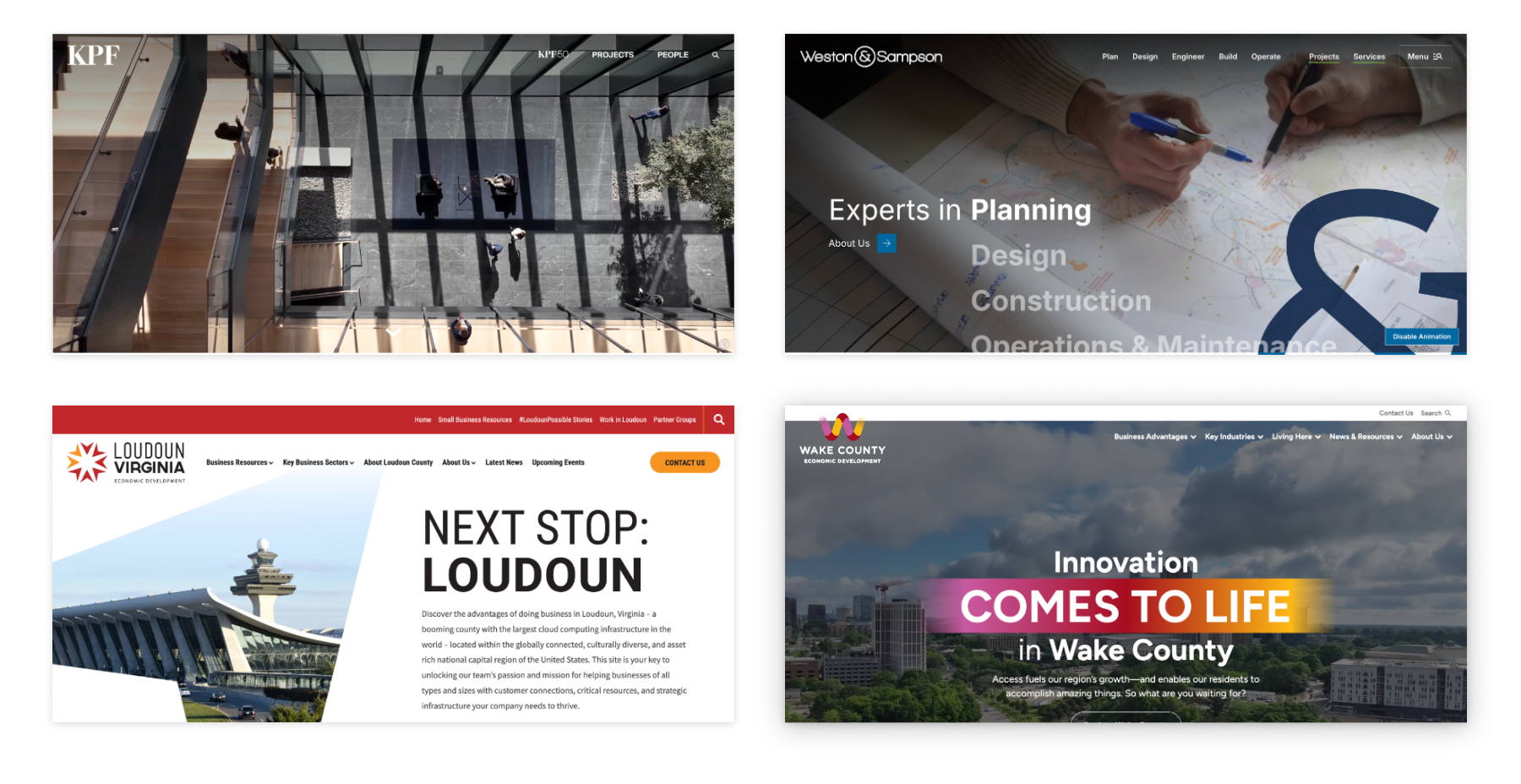 We partnered with a wide range of architecture, engineering, and construction firms, as well as building on our work with a number of economic development web design projects. Across these projects, showcasing each client’s expertise and services was a top priority. For long-standing client KPF, we incorporated custom animations and interactive elements to convey the scale and impact of their larger-than-life projects. On the new Wake County Economic Development website, we used subtle animations to create an engaging and fun experience.