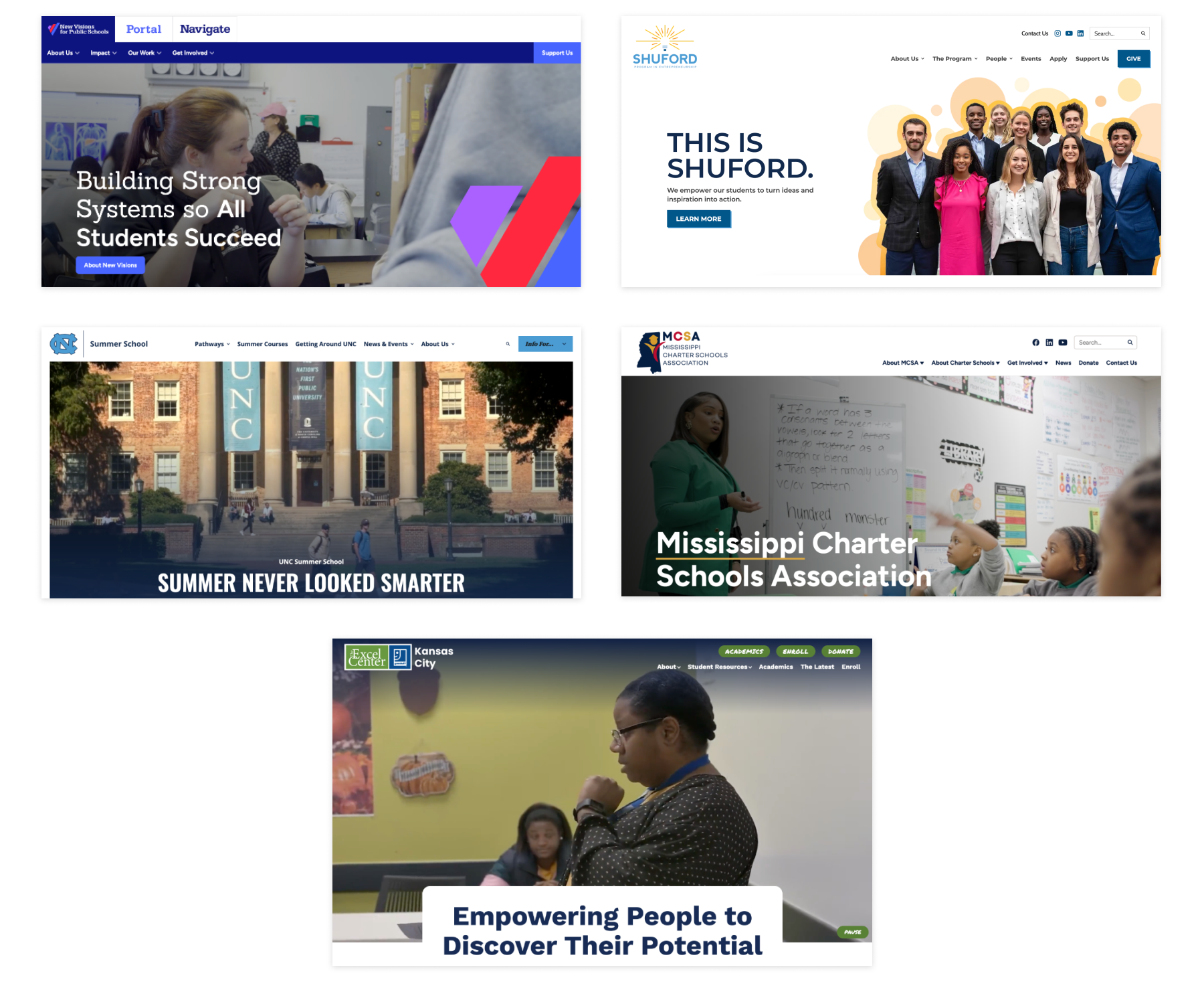 In the education space, we launched several sites, ranging from education adovacy sites to website designs for higher education, including a few for UNC – alma mater for many NMC'ers! These included UNC Summer School and Shuford entrepreneurship program. We also helped create dynamic and informational resource hubs for New Visions Public Schools and the Mississippi Charter Schools Association.