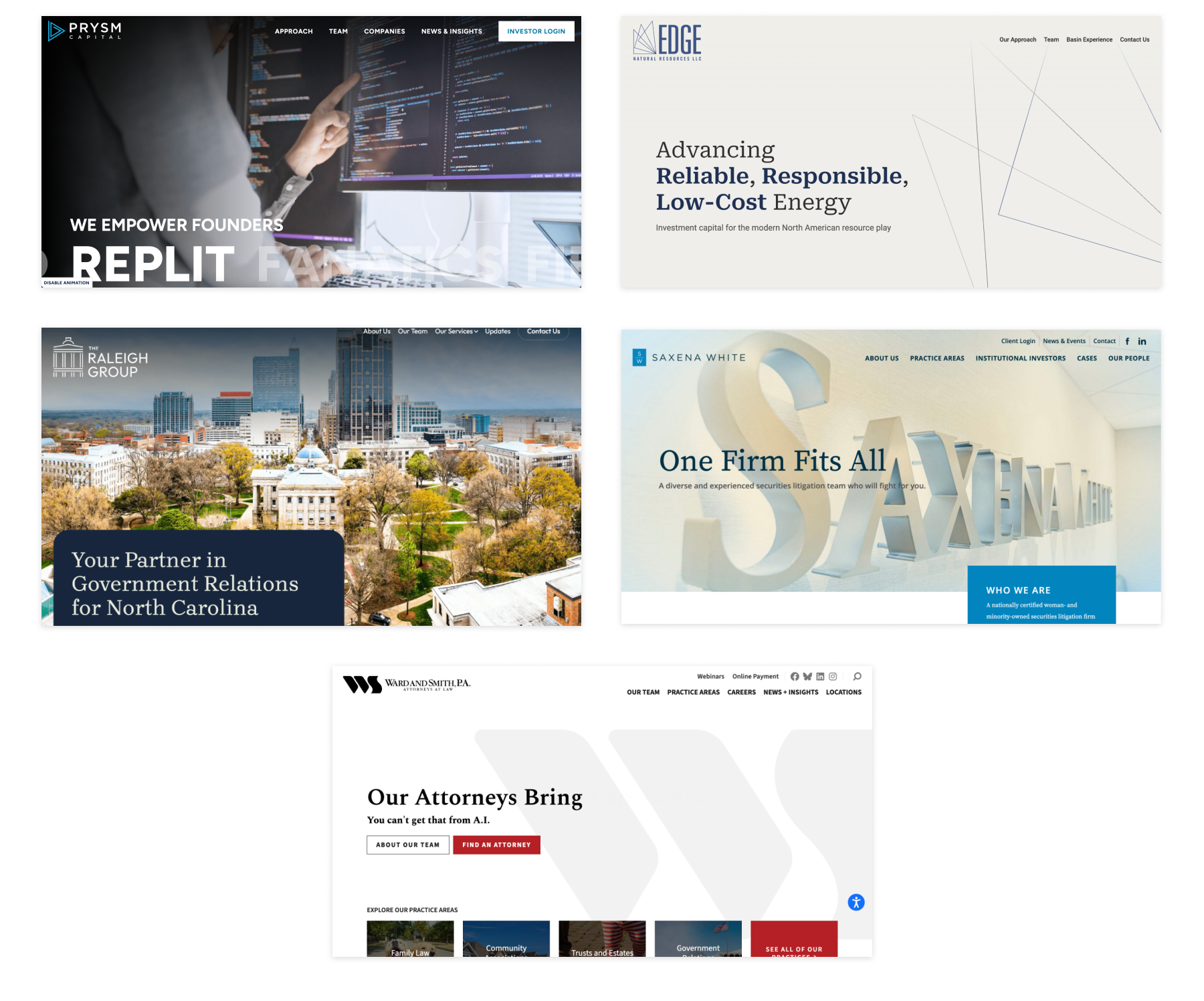 We launched modern sites for private equity, insurance and legal groups, building on the large number of law firm website design projects we've worked on over the years. For Prysm Capital, we utilized animation and interaction to bring an engaging experience to an otherwise clean design. 2025 also brought a design refresh for long-time client Ward & Smith.