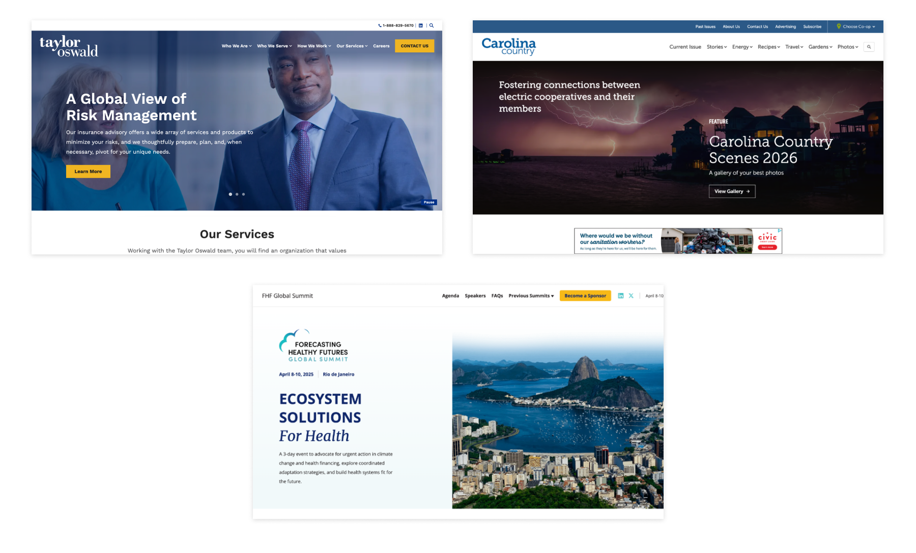 We also built a content-hub for Carolina Country magazine, refreshed the site for long-standing client Taylor Oswald, and launched an event microsite for the FHF Global Summit.