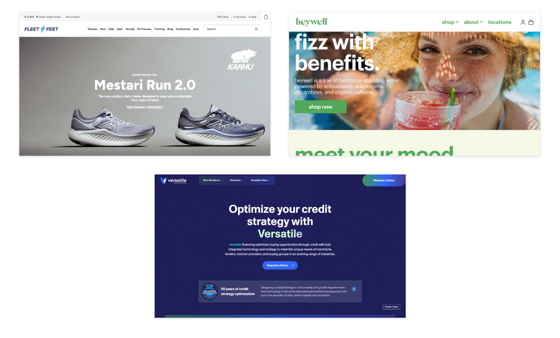 We continued our long-standing relationship with Fleet Feet, by making several site-wide improvements and design updates. We also developed sites for Heywell sparkling water brand and Versatile Credit.