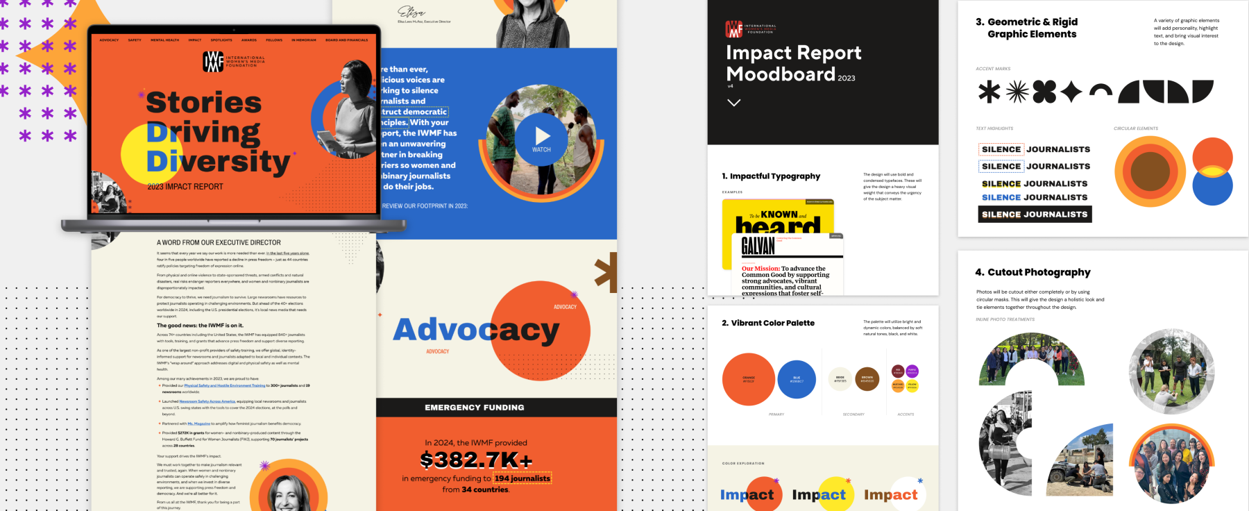 That was the case for our longtime client IWMF, a global organization built to serve the holistic needs of women and nonbinary journalists. Each year, IWMF publishes a web-based annual report to showcase their work, global impact, and new initiatives. For the 2023 Impact Report, they established and shared a visual framework for colors, type, and graphics that allowed us to easily present their content in an impactful and visually pleasing way within their project timeline.