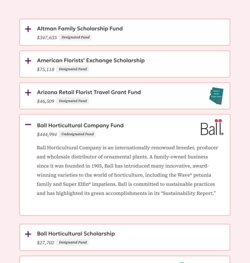 Driven by the mission of strengthening and growing the industry, the Endowment collaborates with donors and partners to grow their portfolio and distribute funding across key focus areas. Major thematic initiatives include addressing industry challenges and supporting the next generation of floral professionals.