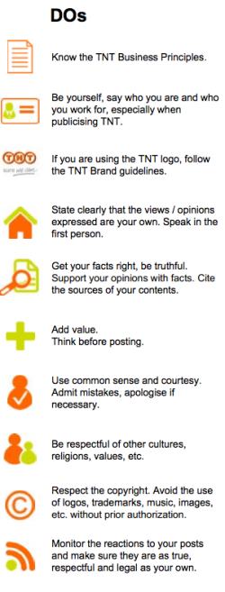 TNT is a great example of what your organization's guidelines can look like. They break down the basics and then have a well-designed chart of DOs and DONTs.