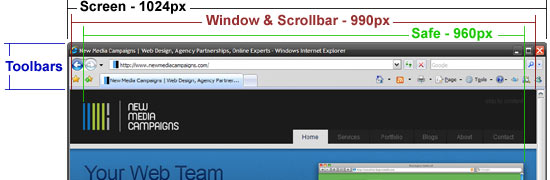 This is why setting your working resolution to 72dpi is not enough! Instead it is important to understand the dimensions of the media in terms of pixels. Monitors may have varied resolutions, but in 2009 it is safe to design for a minimum resolution of 1024x768. This does not mean that you can use all of those pixels as you can see below: