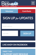 The campaign wanted a fresh design for this new candidate and to use imagery to help the site really stand out to visitors. The dominant element on the homepage is a picture of Andy with his wife and children with an email signup to enlist supporters. This image immediately gives voters an inside look at the candidate and makes it easy for them to get involved. Paired with the family image is the campaign tagline “Stronger Families, Safer Communities,” and a list of the campaign’s signature issues.