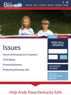 This campaign site firmly establishes Andy Beshear as a leading candidate devoted to the citizens of Kentucky. After our previous work designing the Attorney General campaign website for Mark Herring of Virginia — which was a finalist for statewide campaign site of the year — it was rewarding to work with another inspiring candidate for the same office.