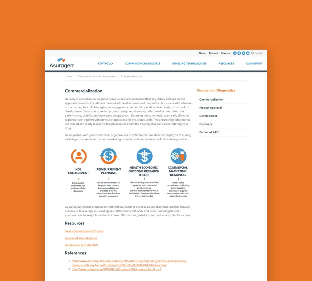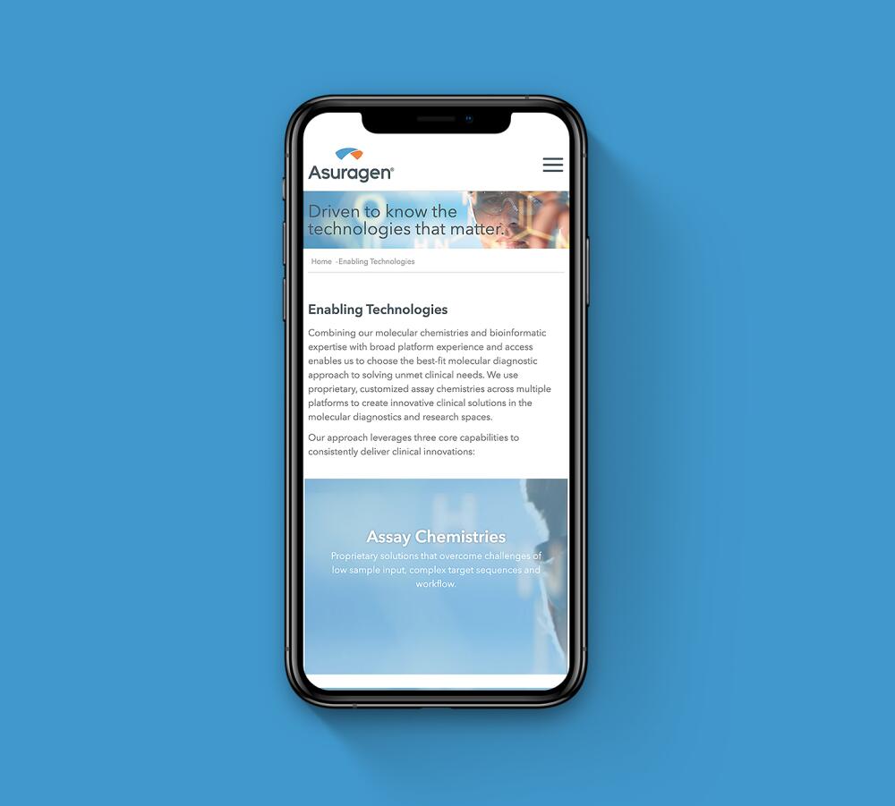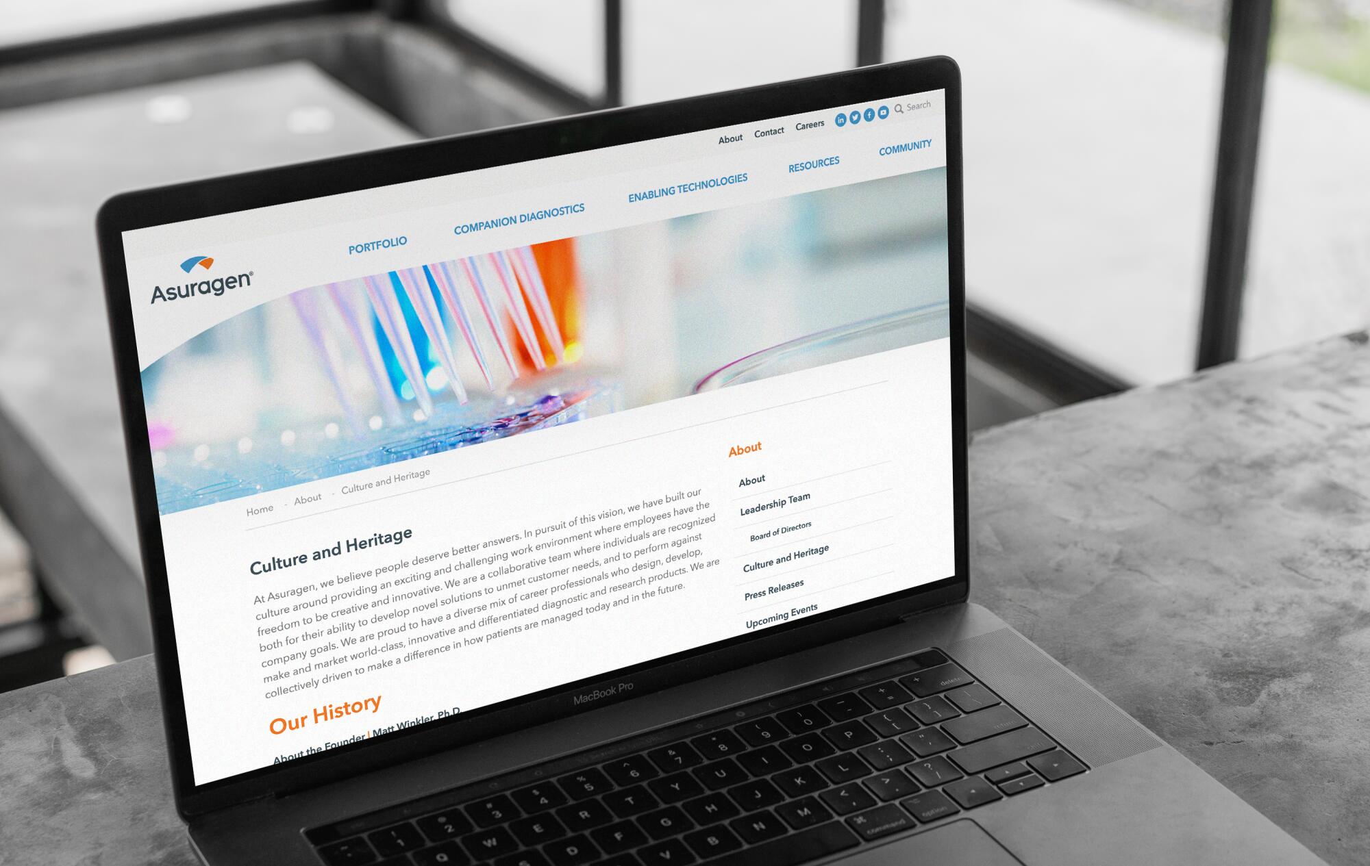 The company came to us, looking for a partner who could help them shape their digital presence and execute ongoing SEO and data analytics work. They wanted a design that not only expressed the cutting edge nature of their work, but one that also connoted the very human element of their work. Asuragen's tagline is "It's more than a Result. It's a person," and that's a mantra that permeates everything they do, making it important that the site had a certain warmth and humanity to it.