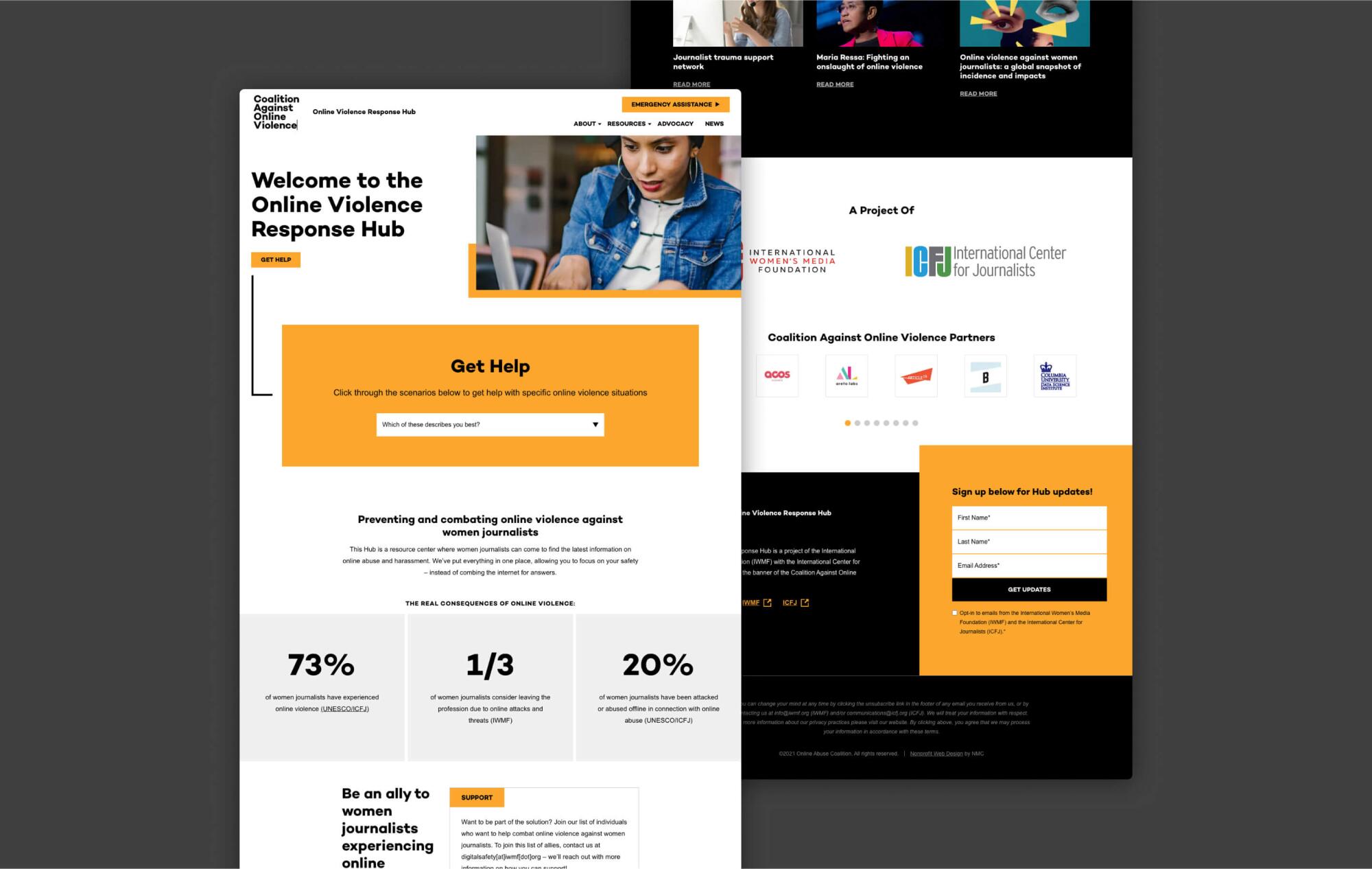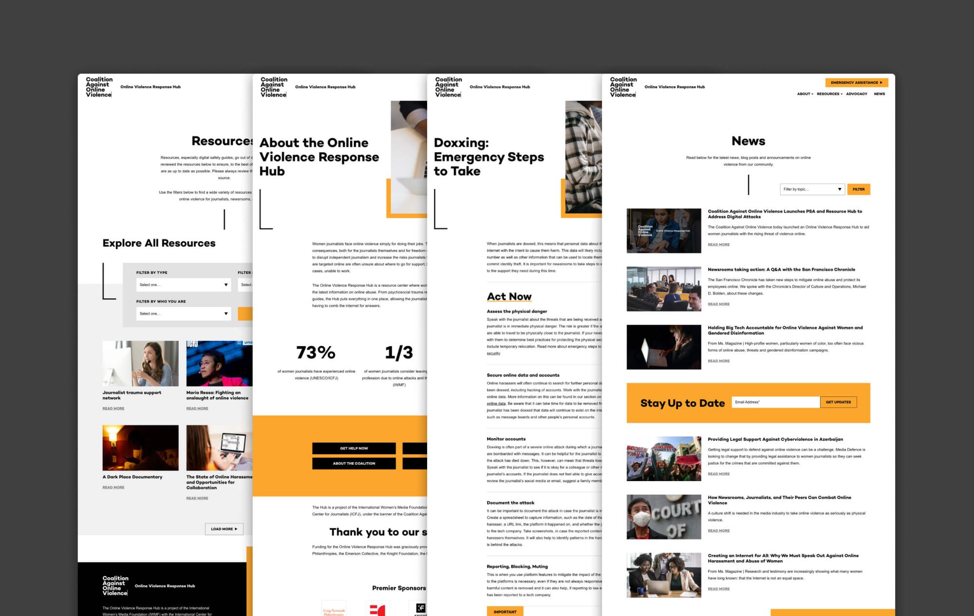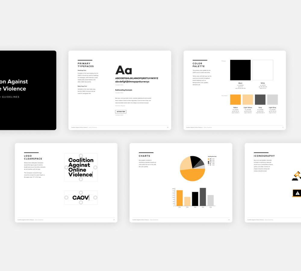 In an effort to support the victims of online violence, our friends and partners at the International Women’s Media Foundation and International Center for Journalists began building a global coalition of media organizations to combat the troubling increase in abuse. Since both groups had partnered with us on nonprofit web design, branding, strategy, and design work in the past, they approached us again to help create a brand, visual language, and website to house resources for journalists, advocate their cause, and work to make real change. The new initiative would be branded the Coalition Against Online Violence (CAOV).