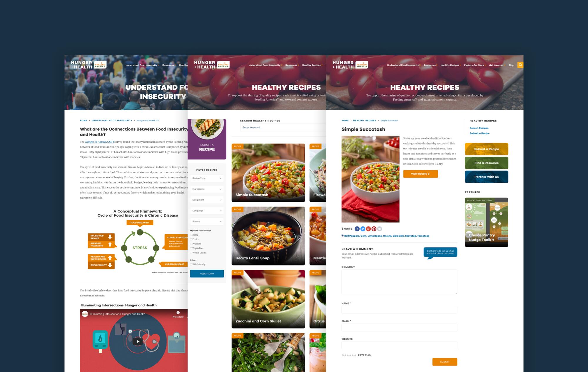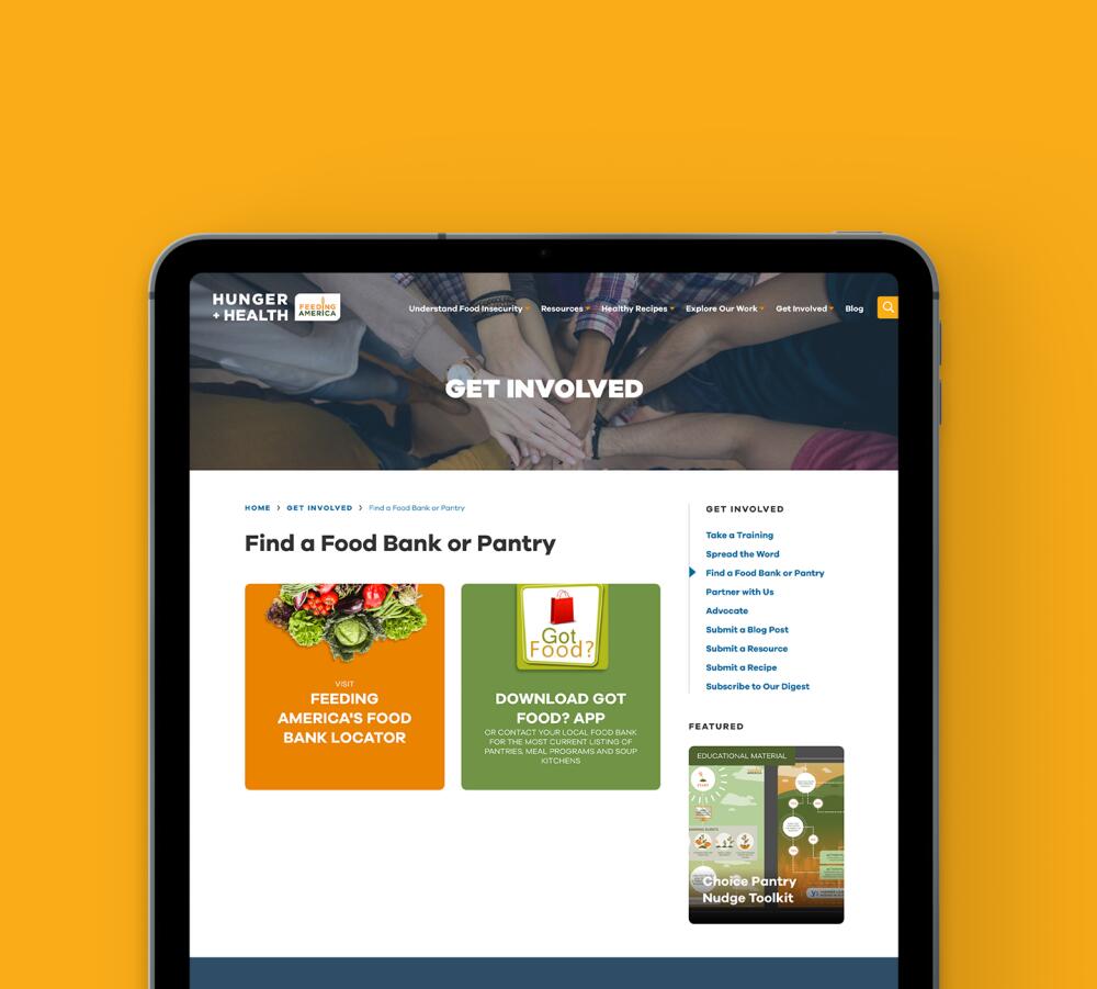 Feeding America is one of the most established non-profit brands in the country, partnering with more than 200 food banks and 60,000 food pantries and meal programs. The organization was launching a new initiative to educate and engage their audience on the intersections of food insecurity, nutrition, and health. The new effort was meant to be a standalone and substantial resource, so they wanted to create an independent brand and web presence for it.