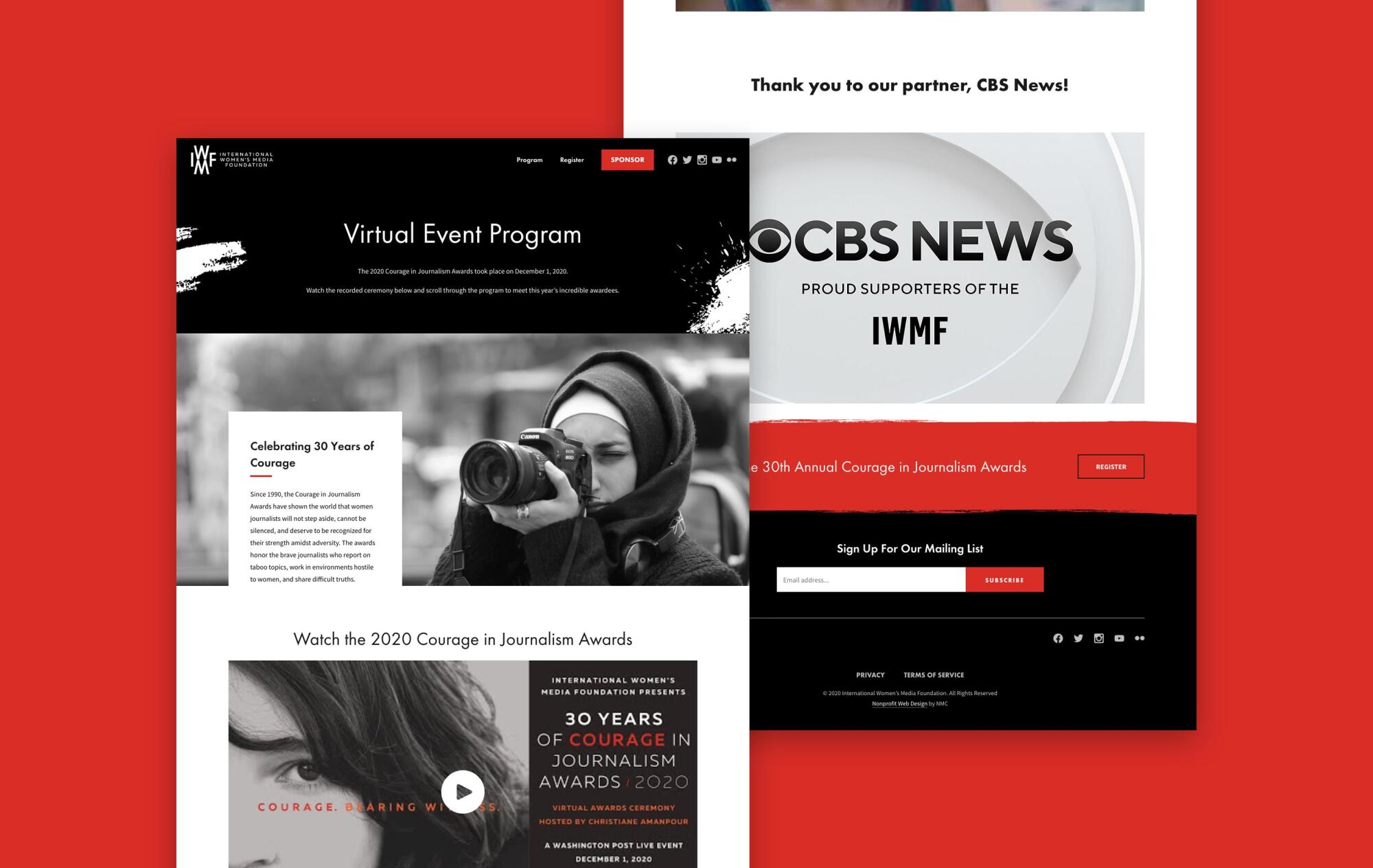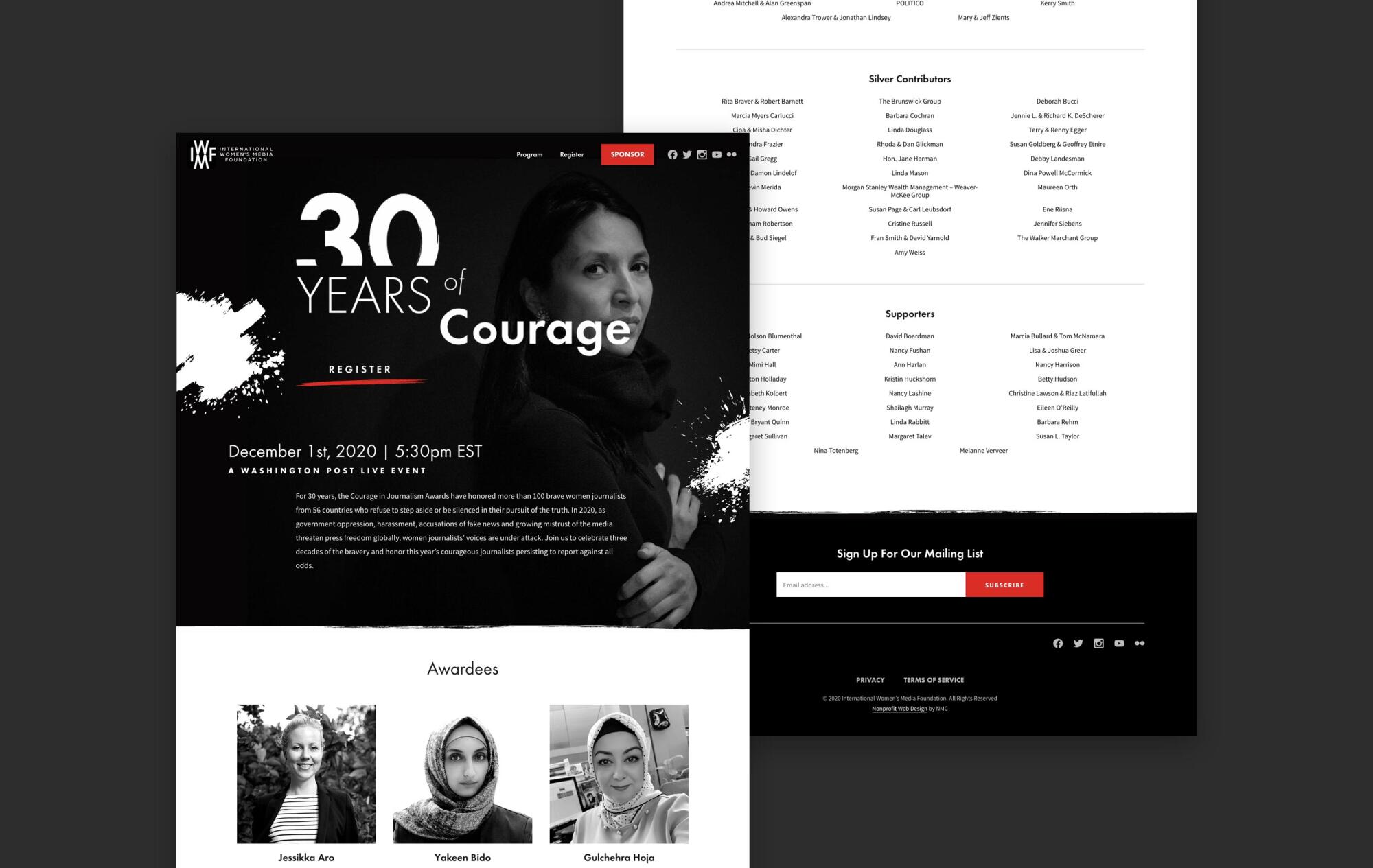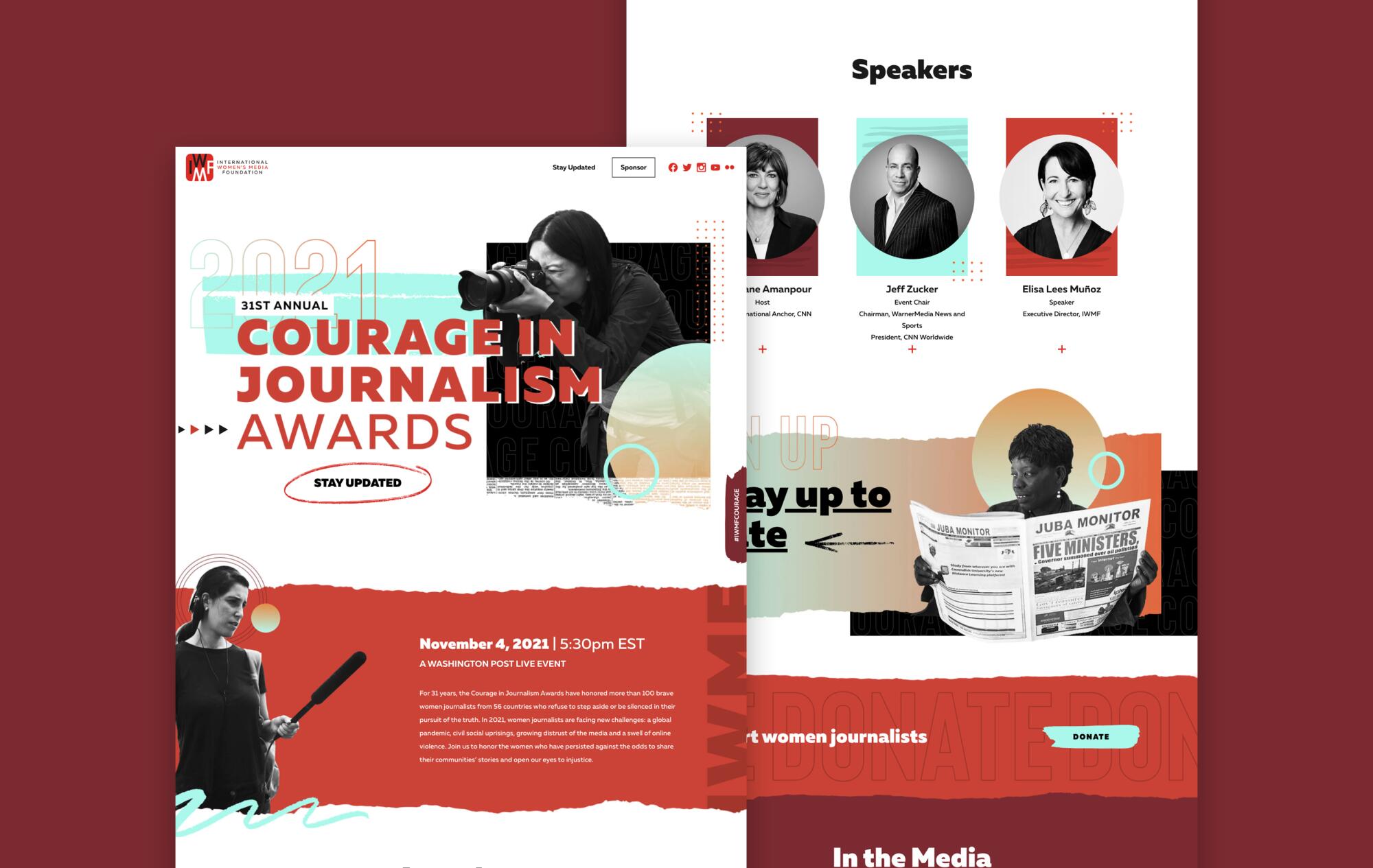 In order to boost excitement and spread the word about the event’s virtual format, we worked with the IWMF to develop a microsite that would introduce the award recipients and encourage supporters to register online. The result: a bold digital hub for The Courage in Journalism Awards that will support the IWMF’s long term event planning needs in addition to publicizing the event each year.