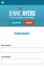 The site also ensures that it is incredibly easy for visitors to participate in Jenné’s campaign, both by signing up to join the campaign and by donating financially. The main menu features the “Volunteer” and “Donate” sections in bold colors, so that visitors can navigate easily to each of them. The “Volunteer” page itself features a simple, straightforward form allowing visitors to supply information about themselves and how they would like to contribute, and the “Donate” page explains clearly how to donate by check or online.