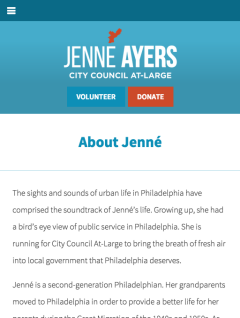 The final result is a clean, vibrant website full of the personality of Jenné Ayers and Philadelphia. The site makes it easy for visitors to learn about Jenné, participate in her campaign, and interact with her on social media, regardless of whether they are using a phone, tablet, or computer.