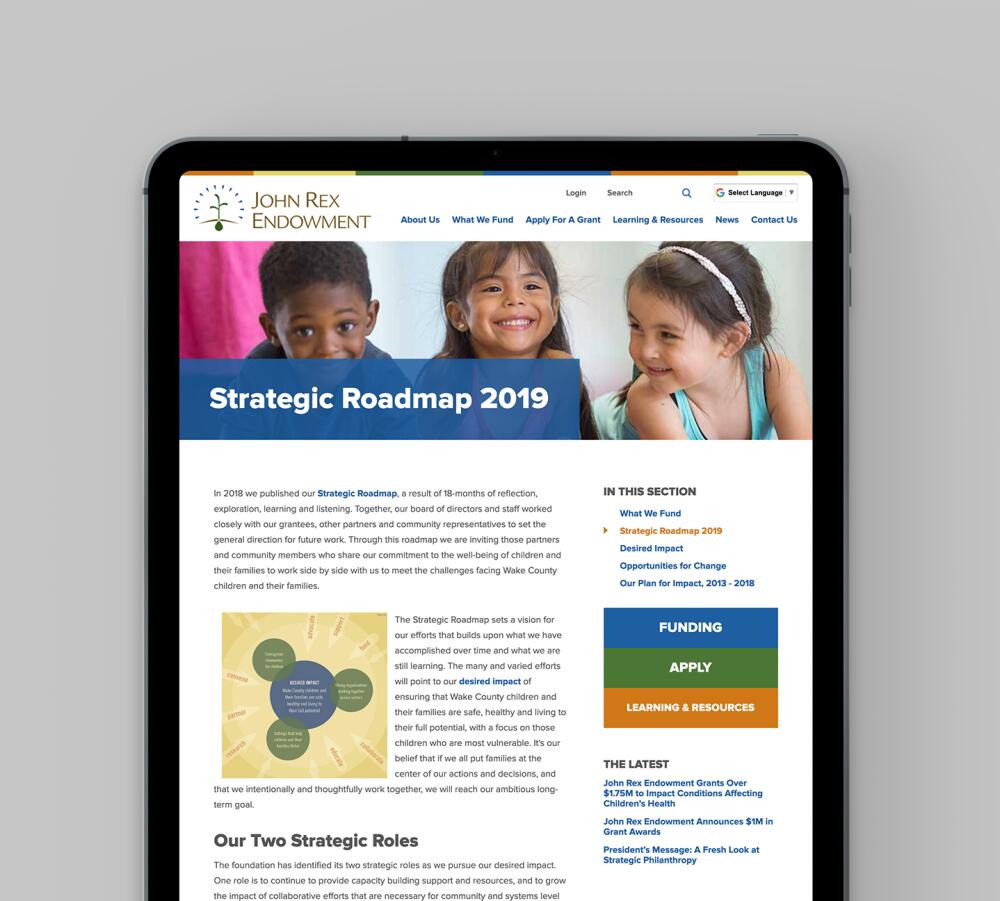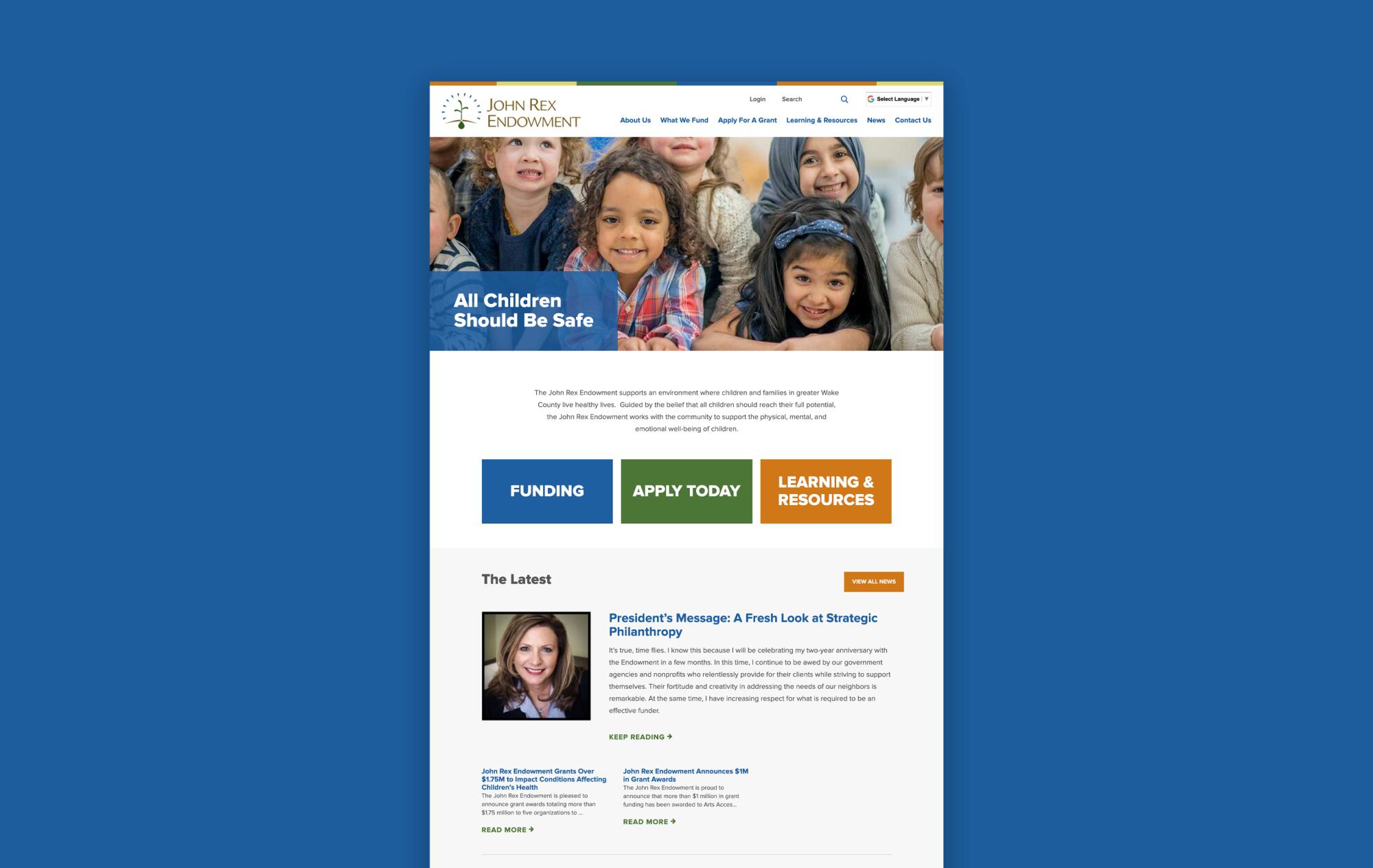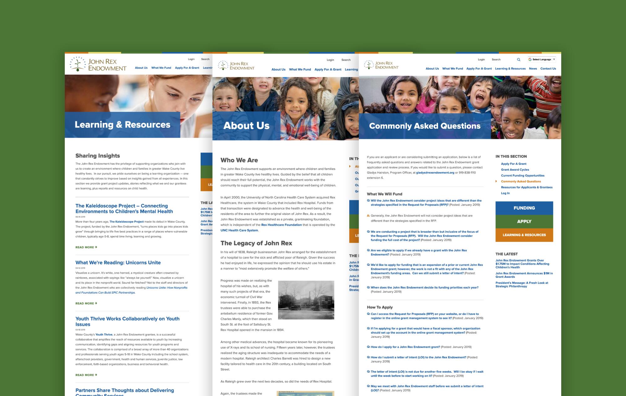 The John Rex Endowment, a non-profit organization based in North Carolina, supports the well-being and health of children in Wake County. The organization, which was established over a decade ago, has had the same website since its inception. Rex approached New Media Campaigns to create an updated, elegant, and simple site that reflects the organization.
