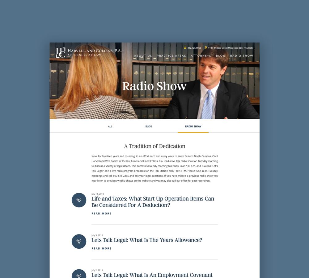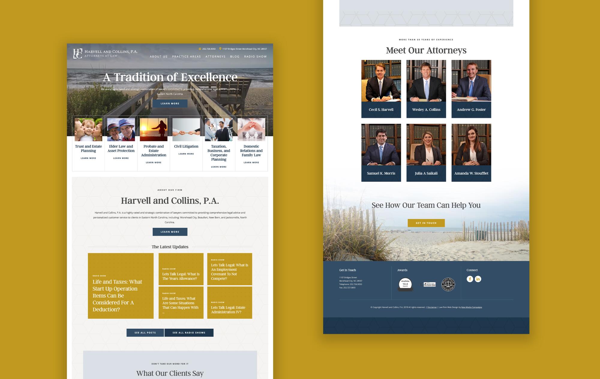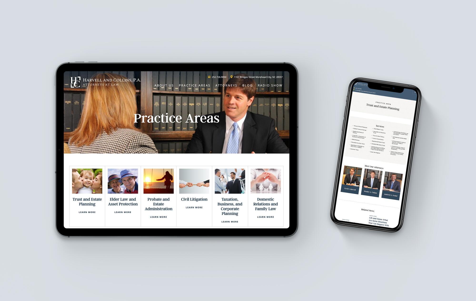 Harvell and Collins, P.A., a law firm based in Morehead City, North Carolina, has evolved from a solo practice to a team of lawyers and legal professionals. The firm has amassed decades of experience as a general practice law firm with a focus in Estate Planning, Elder Law, and Litigation. They came to us for our experience in law firm website design to help them design and develop a site to impress potential and current clients.