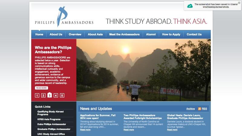 Launched in 2006, the Phillips Ambassadors program awards UNC undergraduates a scholarship towards the cost of studying abroad in Asia and complete an academic program that consists of activities before, during, and after their trip. The program has seen huge success in its first few years and continues to expand on their initiative to expand student experience in a global context. In order to truly capture the experience of the students and program, the Phillips program approached New Media to design a new and exciting website.