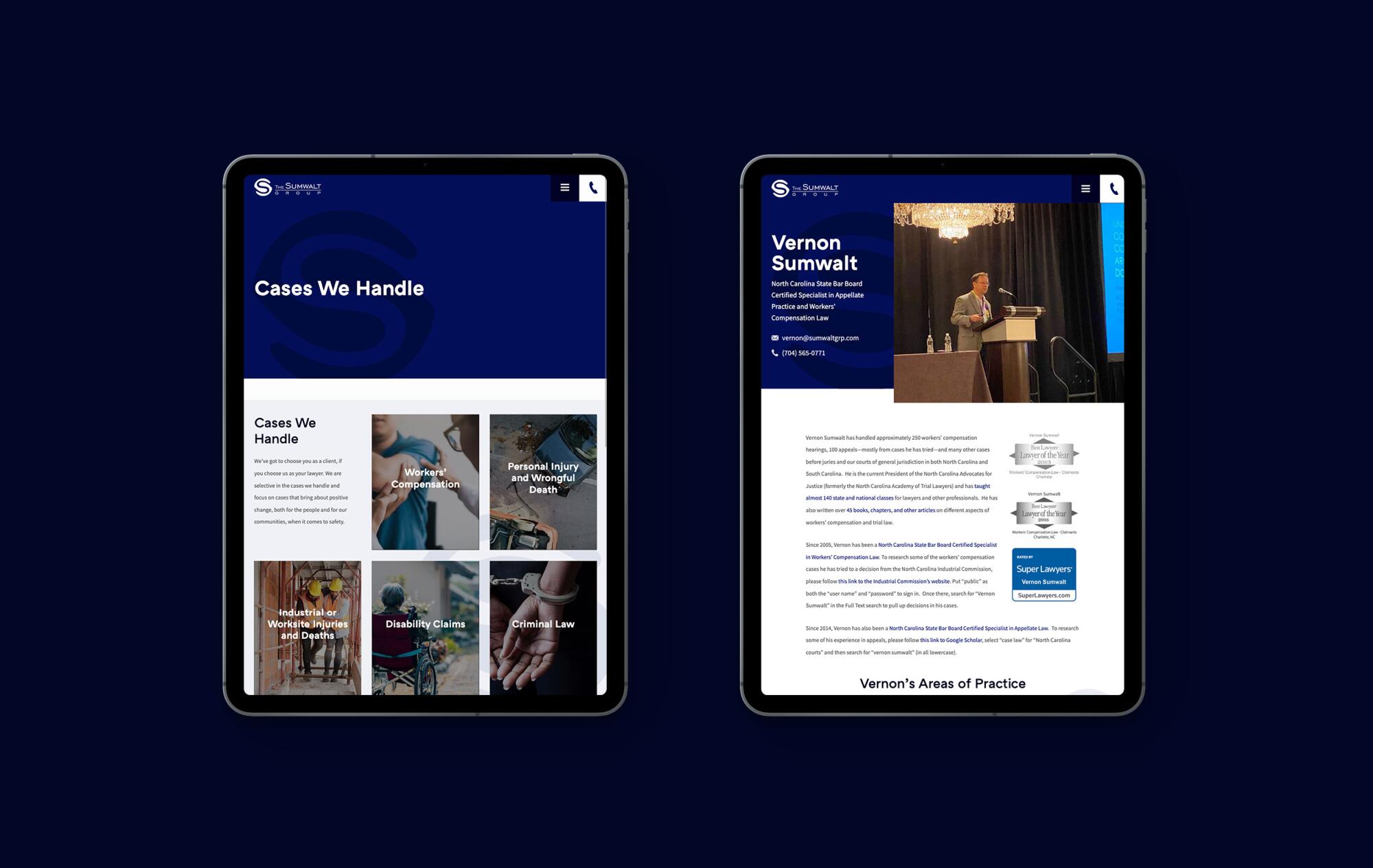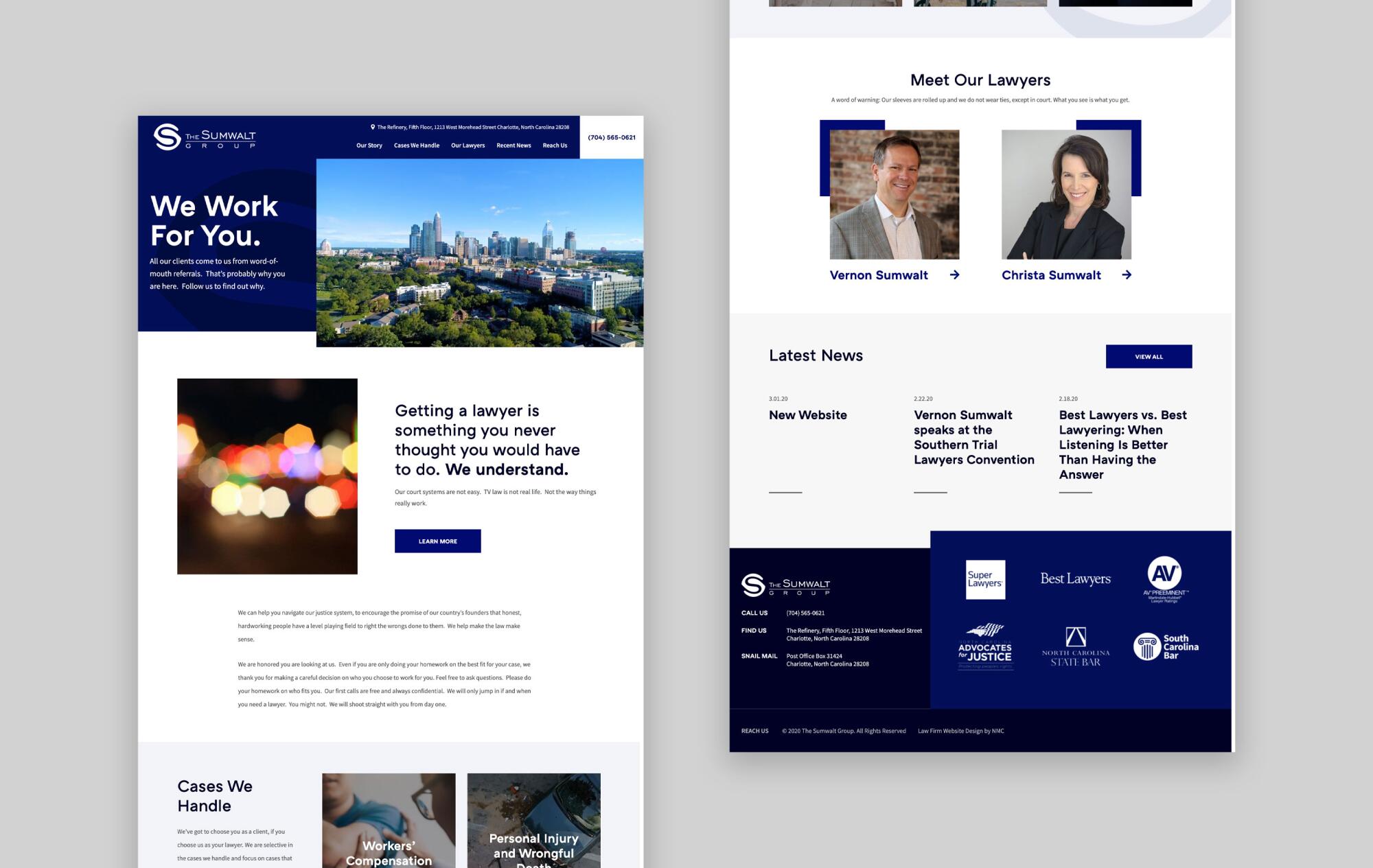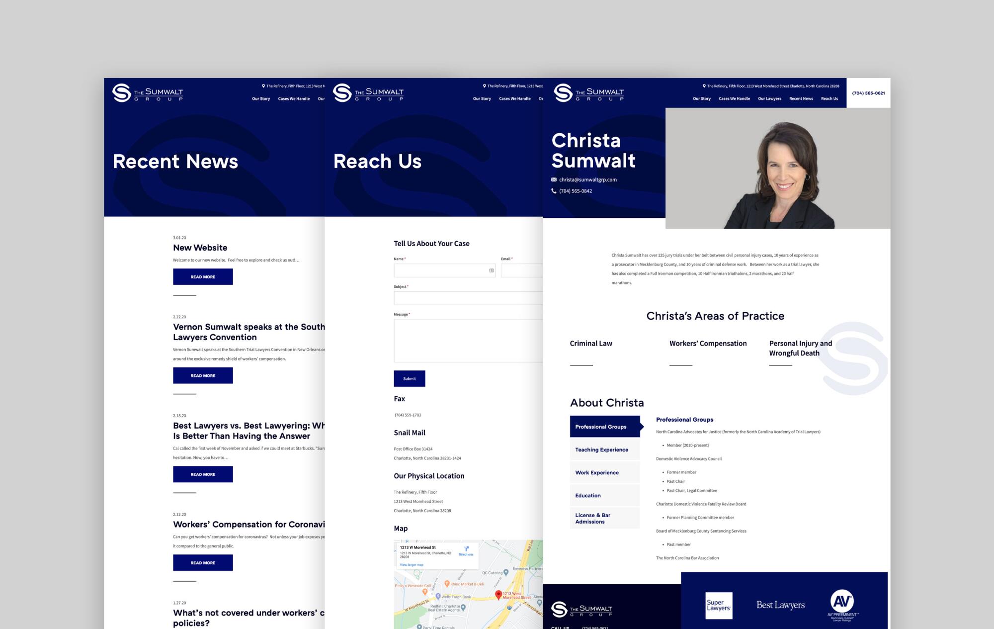 For the past twenty years, the trial lawyers at The Sumwalt Group have guided clients through the justice system to successful results. Because the team operates exclusively through word-of-mouth referrals, its experienced attorneys are distinctly attuned to the nuances of client needs. When the group branched off into their own firm, The Sumwalt Group, they approached us with the goal of reflecting this personal touch in a modern and focused law firm website design.
