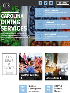 Working backwards from there, you’ll see that all three actions are the most important visual elements on the home page and what most visitors are interested in. But beyond that is a wealth of site information: details about meal plans, catering, and even UNC Dining's commitment to sustainability, all easily accessible from an interactive menu. Click or tap for instant access to all the site's content at a glance.