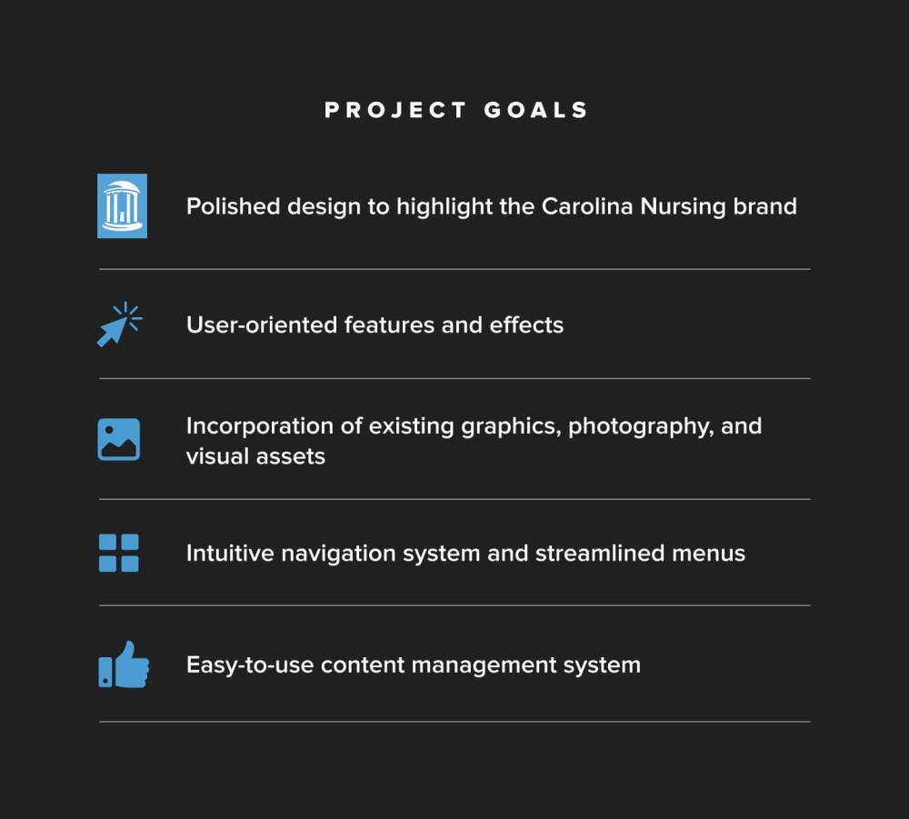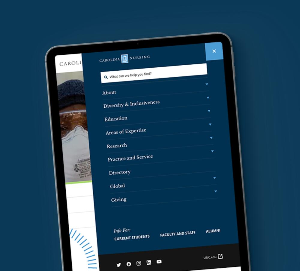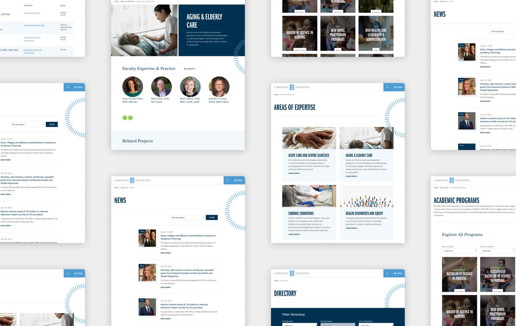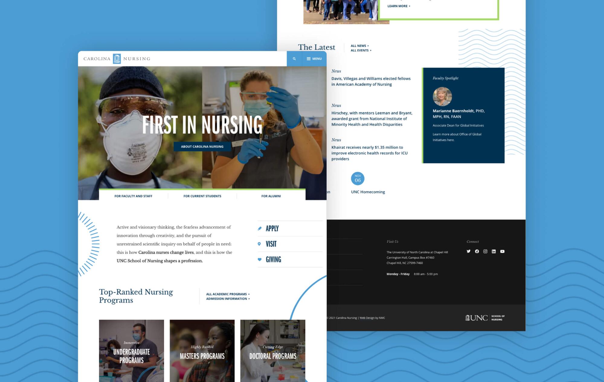 Knowing that our understanding of the UNC brand runs deep, Carolina Nursing approached us for a higher education website design that would showcase the school’s distinctive offerings within a modern, intuitive, and scalable online platform. By leveraging our work on similar projects for UNC Kenan Flagler, UNC School of Information & Library Science, and UNC Campus Rec, we were able to efficiently evaluate Carolina Nursing’s core objectives and transform their vision into a website that will support their needs for years to come.