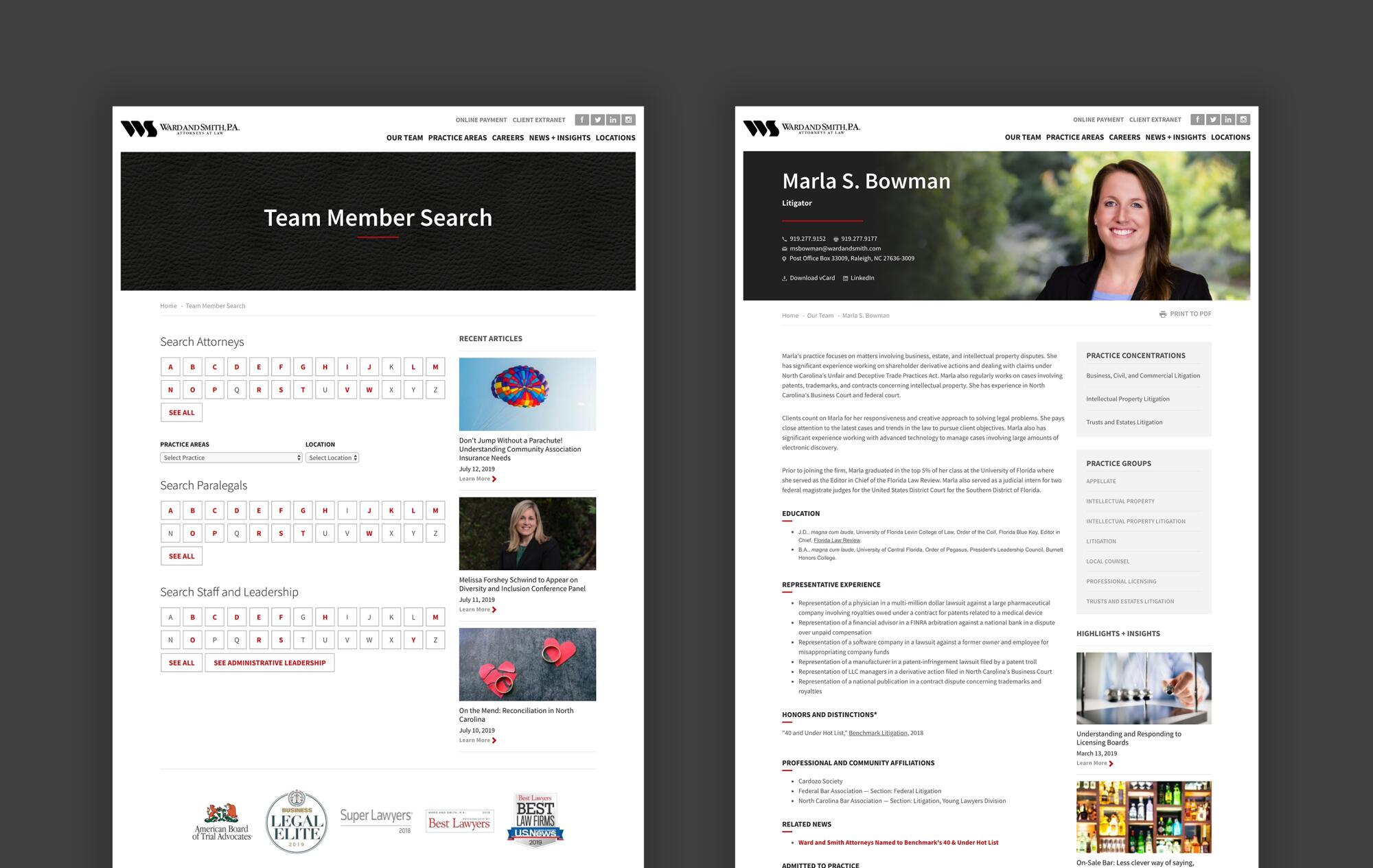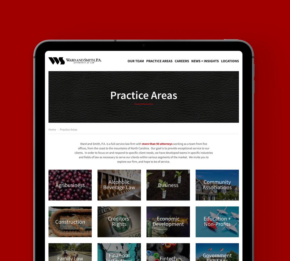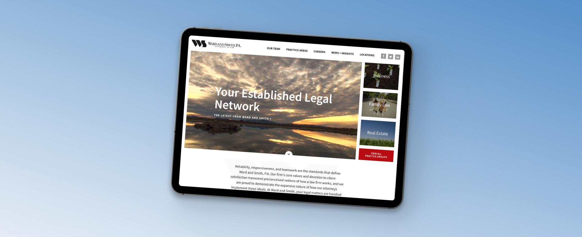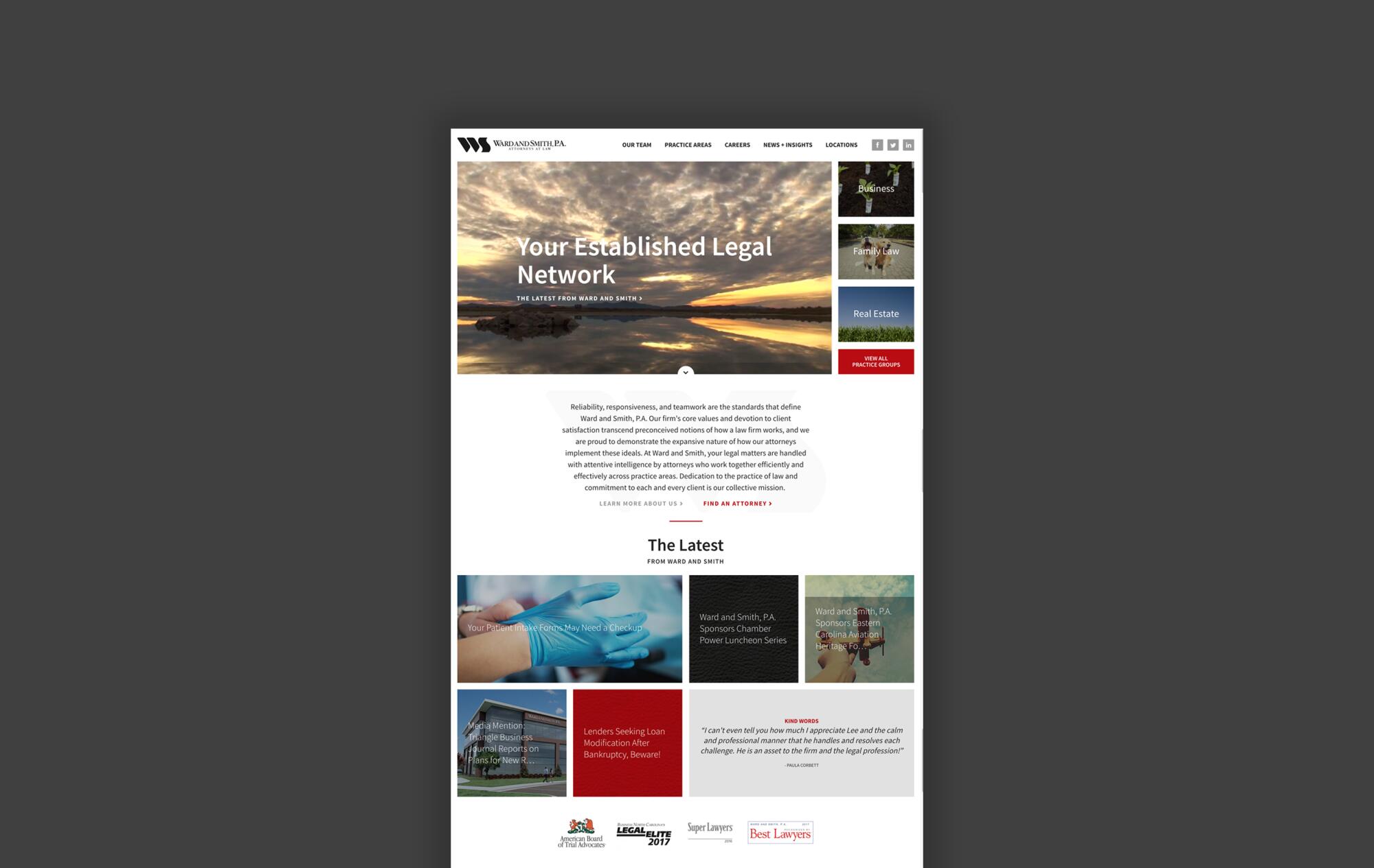Ward and Smith, P.A. is a full service business law firm with five offices across North Carolina, more than eighty attorneys, and nearly thirty practice groups, from Agribusiness to Zoning. The Firm approached New Media Campaigns with some ideas about what it wanted out of a new law firm website design - mainly, an updated, more premium web experience featuring a simpler, more unified design that was more manageable and in line with today's web standards. NMC designed and developed the site, working closely with Ward and Smith to ensure the final product was exceptional. Along the way, NMC identified and addressed several key areas for improvement on the new site:
